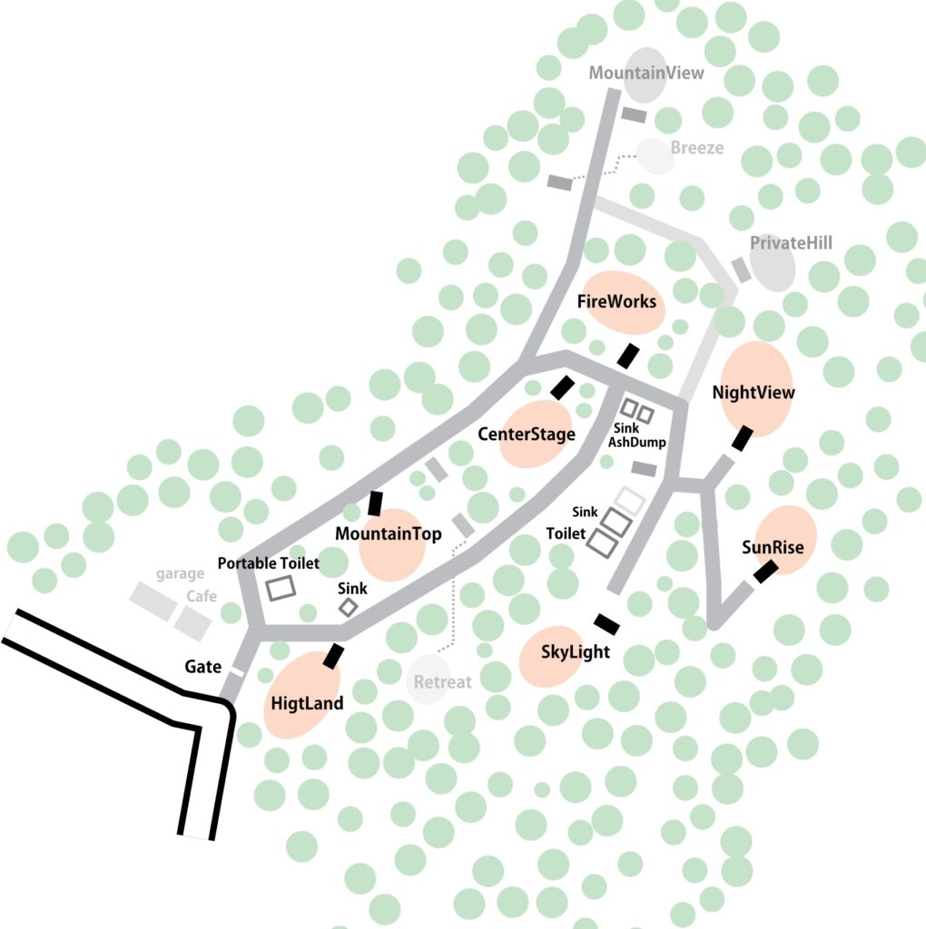 キャンプ場は標高500m前後の傾斜地に立地しています。通路は未舗装で狭いので落下事故など無いよう十分ご注意ください。また急な坂になっている部分が多数あります。極端に車高の低い車はご入場いただけません。FireWorksとMountainTopの標高差は20m程度です。周回路は結構急斜面です。