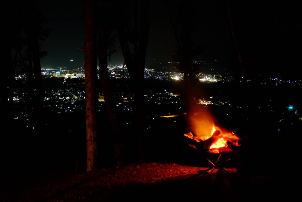 目の前に遮るものがないので沼田市街地の夜景や周辺の山がとてもきれいに見え癒されました。サイトが広く贅沢にスペースが使えます。また他のサイトと距離があり、目線の高さが同じサイトが無いため、そういう面での設営の向きを気にしなくて良いのもありがたいです。